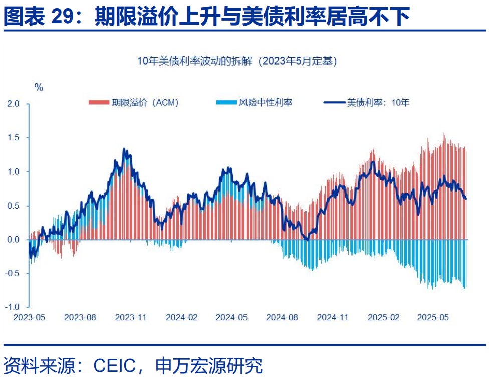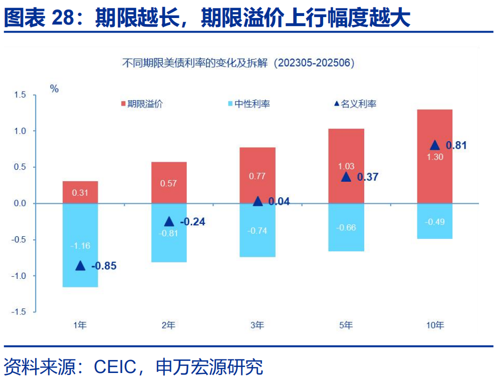 拆分结构可知,自2023年6月1日暂停“债务上限”和7月美联储最后一次加息以来,5年以上期限的中长端美债利率之所以不降反升,原因在于期限溢价对美债利率的正贡献超过了风险中性利率的负贡献。从2023年5月到2025年6月,1年期和2年期美债利率分别下降了85bps和24bps,3年基本保持不变,5年和10年利率分别上涨了37bps和81bps。从1年期到10年期,中性利率的负贡献递减,期限溢价的正贡献递增。从10年期利率的拆解看,随着美联储从加息周期到降息周期的转变,中性利率的贡献由正转负,但期限溢价则大幅上行了130bps,导致10年美债利率的中枢不降反升。