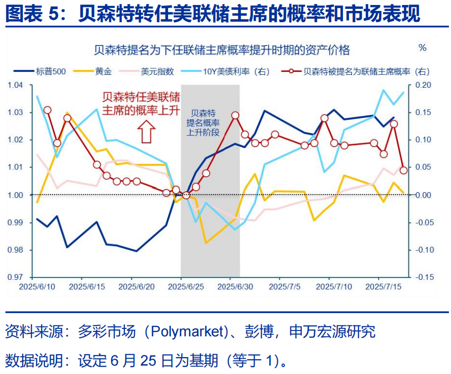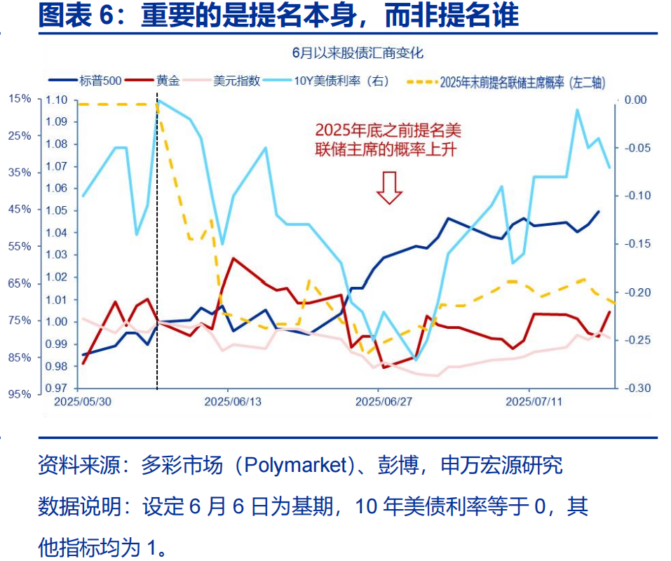 6月初以来,随着年底之前提名下一任美联储主席的概率上升,市场“抢跑”美联储降息。虽然在贝森特接任美联储主席的概率上升期间,市场也呈现“宽松-金发女郎”交易,但本质上,重要的仍然是提名本身,而非提名“谁”——特朗普提名CEA主任米兰代理Kugler理事职位时,市场也呈现为“宽松交易”:美股上涨、2年期美债利率下行(10年利率保持稳定,美债收益率曲线陡峭化)、美元下行、黄金上行,而非交易美联储独立性的丧失。