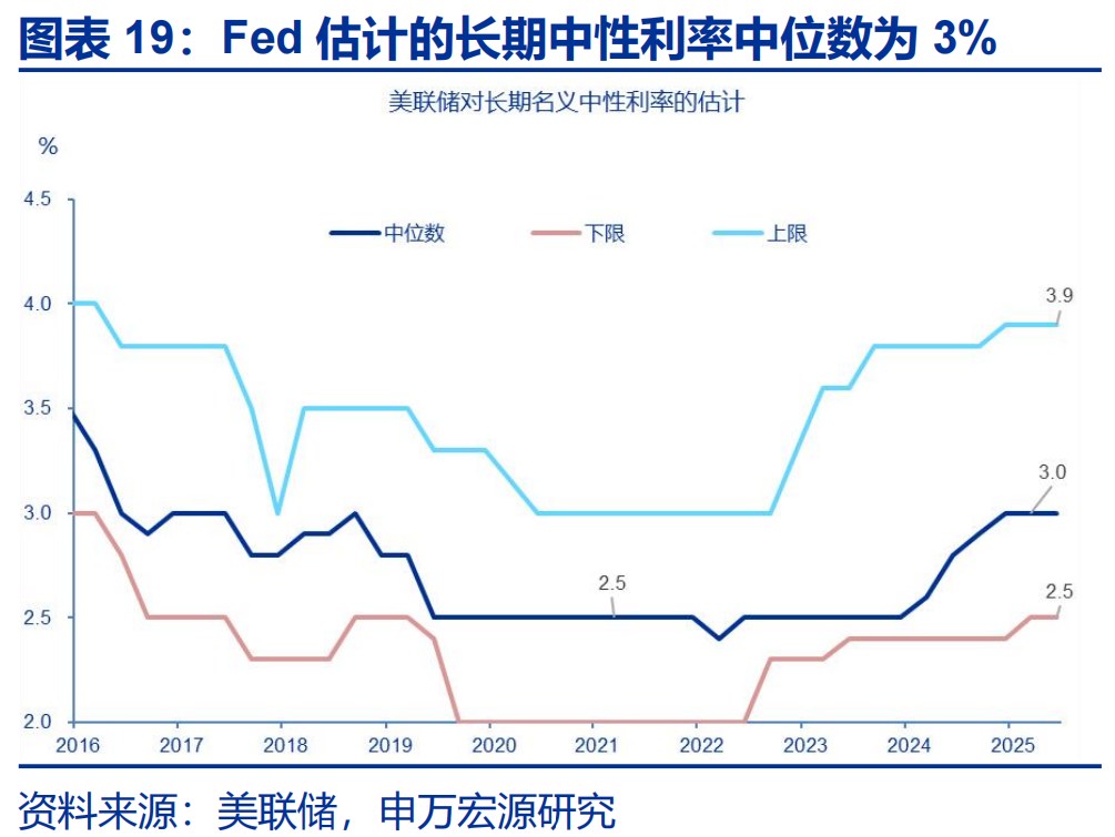 截止到2025年中,综合模型估算、美联储调查、市场定价和市场机构预测的结果可知,美国实际中性利率的区间大致为0.8%-2%,多数估算为1%-1.6%,均值约为1.4%(对应的名义中性利率的中枢大约为3.4%),比美联储经济预测摘要当中的长期预测高40bps。 基于中性利率框架,如果参考均值,当通胀回到2%时,美联储政策利率的合理区间或为325-350bps。