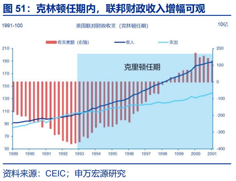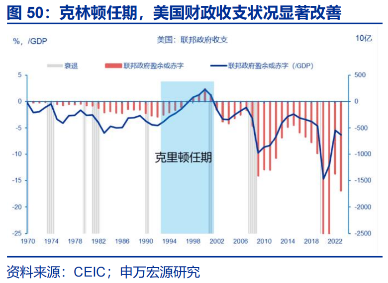 整顿财政的方式无非是开源和节流两种,最有力的方案需双管齐下。以克林顿任期(1993-2001年)为例,1992-2000年,美国财政收支占GDP的比例从-4.5%升至2.3%——70年代以来,美国联邦政府仅在1998-2001年实现财政盈余;政府杠杆率从62%下降到55%(1995年峰值时为65%)。