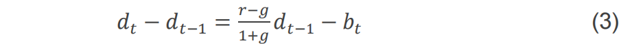 (3)式是债务杠杆率动态的基本方程,可知杠杆率的变化取决于两个因素:第一,当期的基本收支状况bt,基本收支为盈余有助于去杠杆;其次是上一期的债务率dt-1和(r-g)的乘积9,r大于g是去杠杆的有利条件。