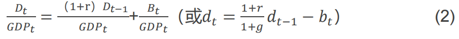 其中,Dt为第t期的债务余额,Dt-1第t-1期的债务余额,r为债务的平均利息率,B为基本收支状况——基本收支为盈余(赤字)会降低(增加)债务。