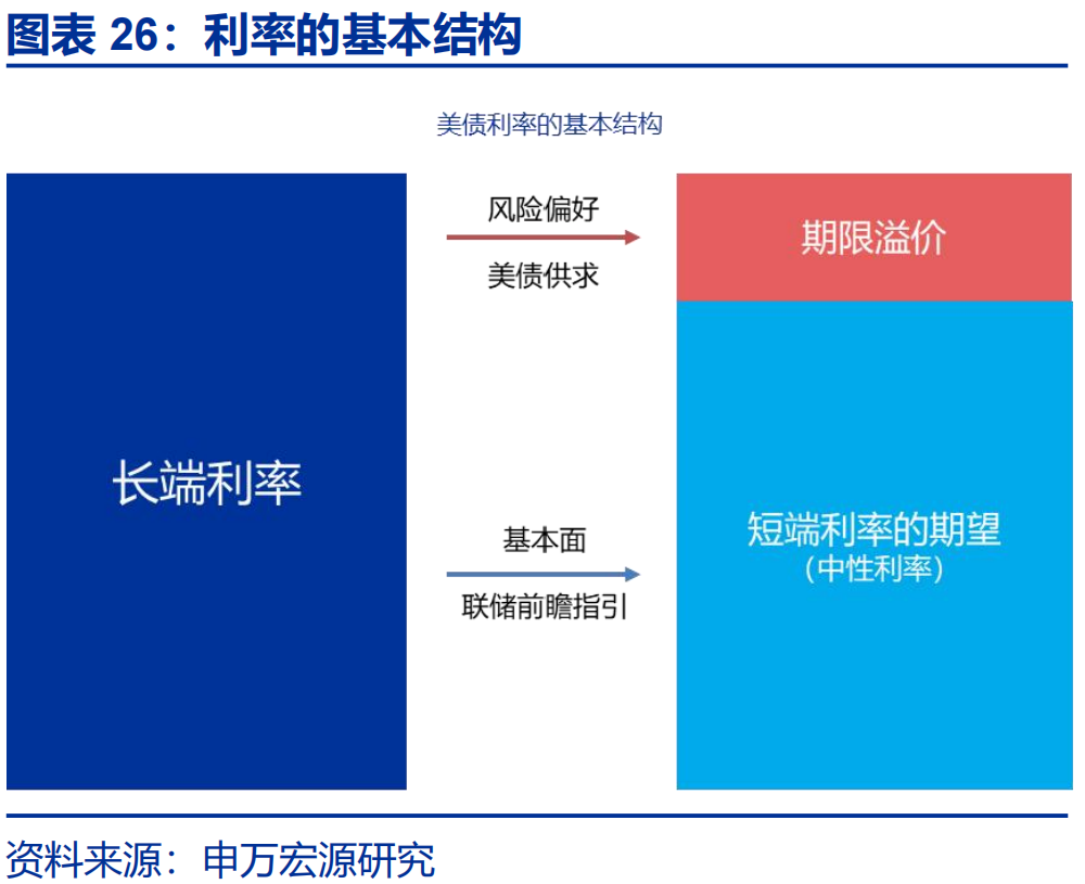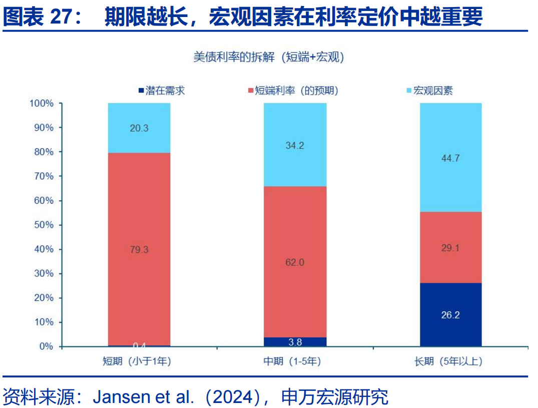 长端利率可以被拆解为风险中性利率和风险溢价,前者表示对未来短端利率的期望——主要受美联储货币政策立场和前瞻指引的影响,后者则是对未来一段时间内通胀、信用等风险的定价。有共识的是,期限越长,宏观因素的影响权重越高,风险中性利率的影响权重越低。Jansen et al.(2024)的研究结论是,期限小于1年的美债利率当中,风险中性利率的权重近8成,宏观因子的权重2成;1-5年的中期利率中,风险中性利率的权重下降到约6成,宏观因子的权重升至3成以上;5年以上的长期利率中,风险中性利率的权重下降到不足3成,宏观因子的权重进一步抬升至4成以上(另外近3成归因于“潜在需求”因子)。