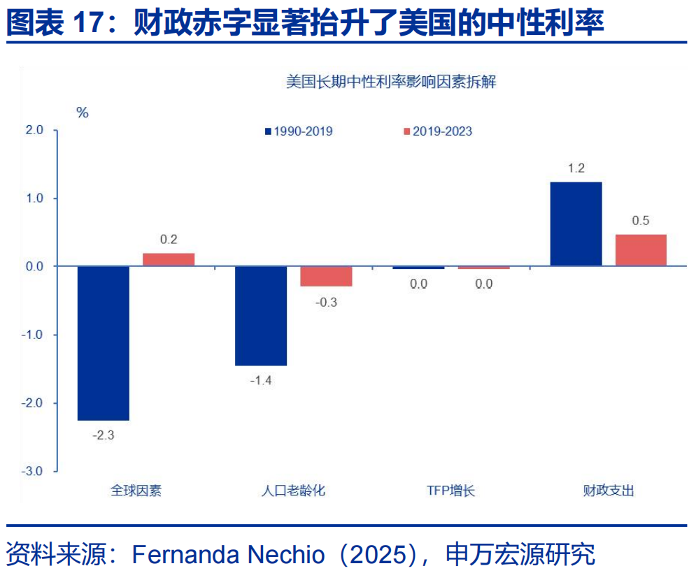 长期而言,中性利率是货币政策操作的“锚”,决定了降息的“终点”。2008年金融危机以来,中性利率上行是发达国家的普遍现象,其中,财政扩张和政府债务杠杆率的提升是主导因素。美国中性利率已从0左右升至1-1.5%左右,这意味着美联储降息的终点或在300-350bp。