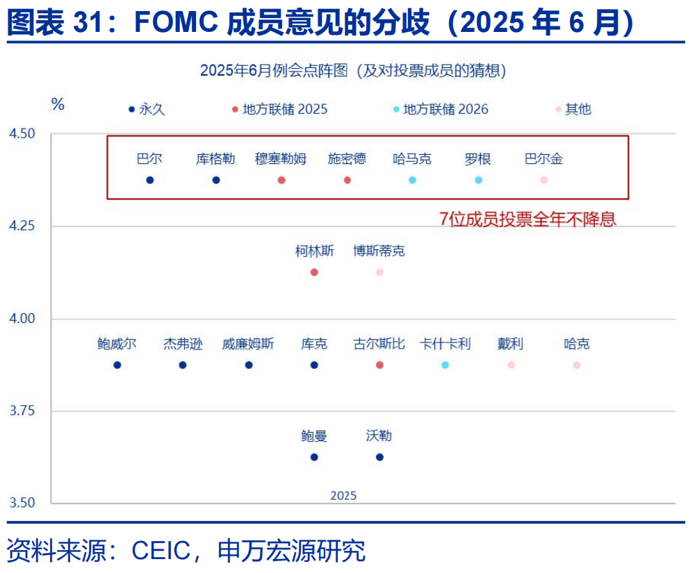美联储利率决策体现了明显的“民主集中制”特征:每次例会,FOMC成员可自由表达利率观点,但在投票环节多会“求同存异”。经验上看,上世纪70年代末以来,FOMC例会中投票反对利率决议的票数呈下降态势。这与利率点阵图中所呈现的观点分歧经常相悖。以2025年6月(季度)例会为例,虽然没有反对票——仅针对6月例会“维持利率不变”的决议,但点阵图显示,有7位成员认为2025年全年不降息、2位认为降息1次。这是美联储的一个特色——在英格兰银行和日央行例会决议中,反对票较为常见。因为,市场经常定价FOMC成员的“分歧”,导致市场出现意外的波动。为此,美联储主席的一个“KPI”便是协调成员的意见,在投票环节中“求同存异”,以减少对市场的扰动,但并非每次都能成功。