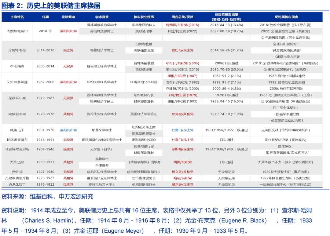 历史上没有出现过总统正式提名、但在参议院投票环节被否的先例,但不乏在提名环节“被放弃”的案例,主要原因是内阁成员或党派成员反对。比如1995年,克林顿总统曾考虑罗哈廷(Rohatyn)接替格林斯潘,但财政部长鲁宾(Rubin)认为他缺乏体系化的货币政策知识。2005年,在与伯南克竞争接任格林斯潘的“影子联储主席”候选人当中,劳伦斯·林赛 (Lawrence Lindsey) 被白宫批评为“政治倾向过强”——任内多次为布什减税政策辩护,小布什总统最终提名了更为中立的伯南克。总体而言,美联储主席(或其候选人)的“身份标签”包括:经济学博士、华尔街投资银行家、财政、货币政策实操者(如在财政部或美联储担任要职)等。