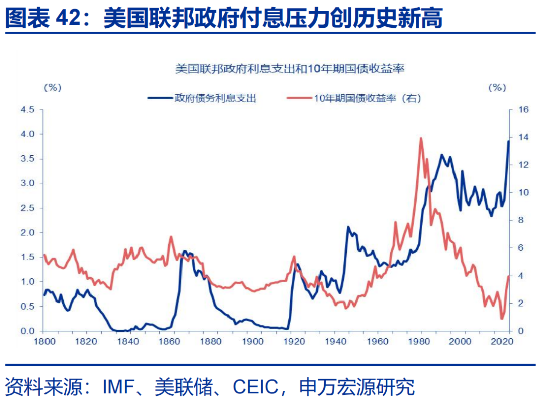 美国联邦政府财政和债务已进入“类战时状态”。联邦政府“花钱解决问题”的冲动有加无已,导致本世纪初以来,赤字率持续攀升,债务杠杆率屡创新高。截止到2024年,联邦政府债务杠杆率已升至120%左右(2020年高达130%),与1946年二战后的高点(121.2%)相当。并且,虽然美债收益率仍处于历史较低位置,但政府债务利息支出占GDP的规模已经创历史新高。
