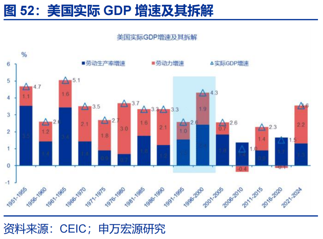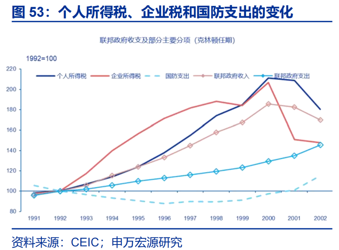 这次“漂亮的”财政整顿,主要有6个解释:(1)互联网革命驱动了“新经济”的繁荣,抬升了全要素生产率,使90年代下半叶实际GDP增速上台阶;(2)海湾战争和冷战的结束带来了“和平红利”,美国国防开支规模及其占财政支出的比例均显著下行;(3)增税:1993年《综合预算协调法案》将个税最高税率从31%提升至39.6%、企业税率从34%提升至35%,90年代下半叶的美股牛市增加了资本利得税;(4)减支:民主党与共和党控制的国会(1995年后)达成妥协,1997年通过了《平衡预算法案》13,限制了非必需开支的增长;(5)大缓和的宏观环境,导致r小于g;(6)“婴儿潮”一代进入收入高峰期——40-50岁高收入人群比例上升,推动了个人所得税增长。1992-2000年,个人所得税占比从43%升至49%,企业税从8%升至10%。归纳而言,无非“开源”和“节流”双管齐下。