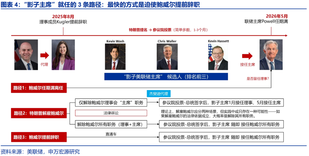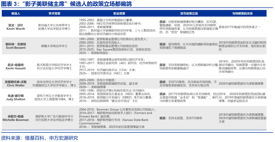 影子主席已经成为市场定价的一条“主线”。对市场而言,提名谁或并非矛盾的主要方面,本质上都是特朗普的“影子”,且货币政策立场都偏“鸽派”。特朗普“解雇”鲍威尔和鲍威尔提前辞职均属“尾部风险”事件,但特朗普“借题发挥”引导市场降息预期是真实有效的。
