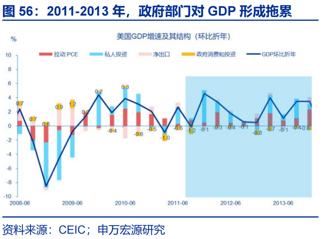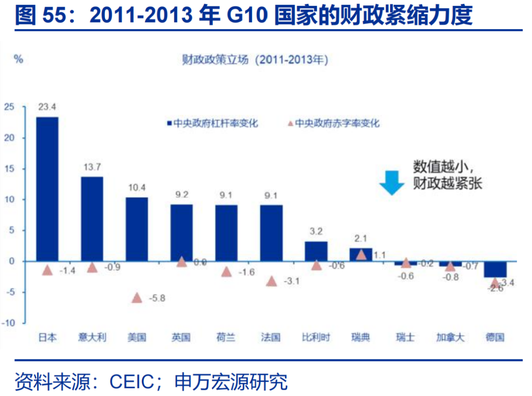 奥巴马任期内的2011-2013年的财政整顿则没那么“漂亮”。为应对2008年金融危机,美国财政赤字率和联邦政府债务杠杆率都大幅抬升。2007-2010年,美国联邦政府赤字率从-2.4%升至-10.0%(+7.6%),杠杆率从56%增加到85%(+29.3%)——在G10国家当中,美国政府的赤字率涨幅位居首位,杠杆率涨幅位居第三。但与之相反,2011-2013年,美国政府赤字率的下降速度也是居于首位的(-5.8%),且远高于其他G10国家——杠杆率仍然抬升了10个百分点,主要是因为财政政策的过快紧缩影响了经济增长。