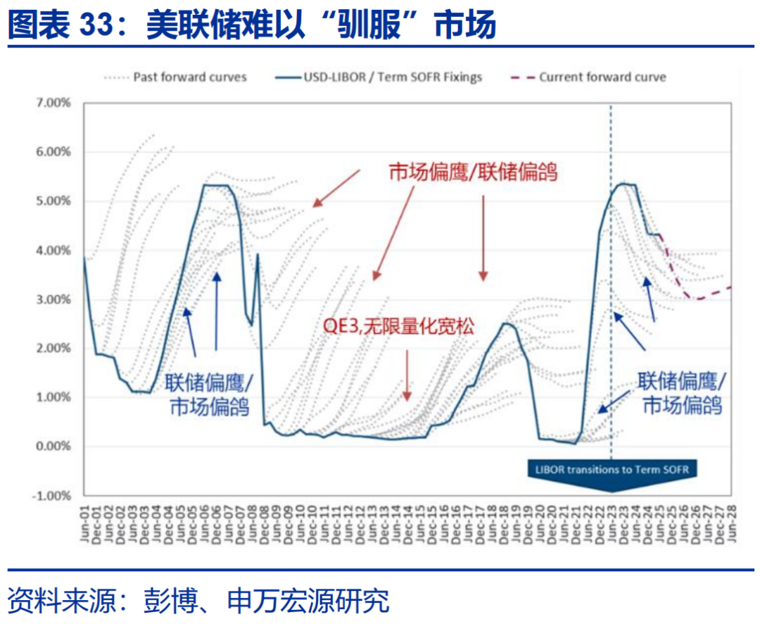 伯南克曾说,“货币政策要发挥影响力,98%靠宣传,2%靠政策本身。”虽然美联储非常重视与市场的沟通,强调政策的透明度,但依然难言“驯服”了市场。一个经验事实是:事后看,货币政策利率的路径与(事前)市场预期的政策利率的路径存在系统性的偏差。一般而言,在加息周期当中,市场的定价有明显的惯性:在美联储加息周期中定价偏“鸽派”,在降息周期当中定价偏“鹰派”。换言之,事后看,货币政策利率总是发挥着“锚”的作用——别跟美联储作对!但事前看,市场总会跟联储作对!