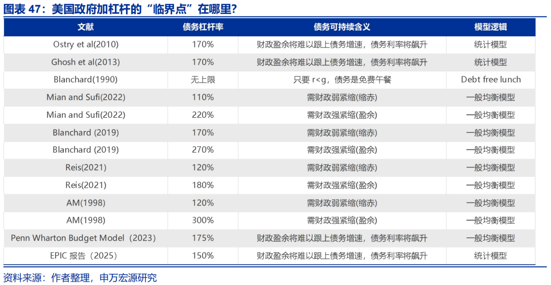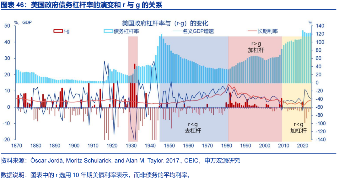 需要厘清的是,财政整顿是必要的,但不等同于说债务已经不可持续,而是说当下的债务杠杆及其未来的发展正前所未有的趋近于这一“临界点”。学术文献对于债务可持续性的研究结论不一,大体认为杠杆率达到110%至180%区间时,债务或不可维系10。2024年,美国联邦政府(广义)杠杆率为122%,这是否意味着债务已经不可持续?并非如此,如果仅考虑公众持有的债务(剔除政府间持有的部分),美国政府杠杆率仅为96%左右,如果再剔除美联储持有的16%左右,杠杆率将进一步下降至80%左右。所以,从狭义上来说,美国政府债务离不可持续的“临界点”仍有较远的距离。但是,这并不妨碍市场要求更高的风险溢价。在这个过程中,r和g的关系会变得更加不利,从而加速“临界点”的到来。