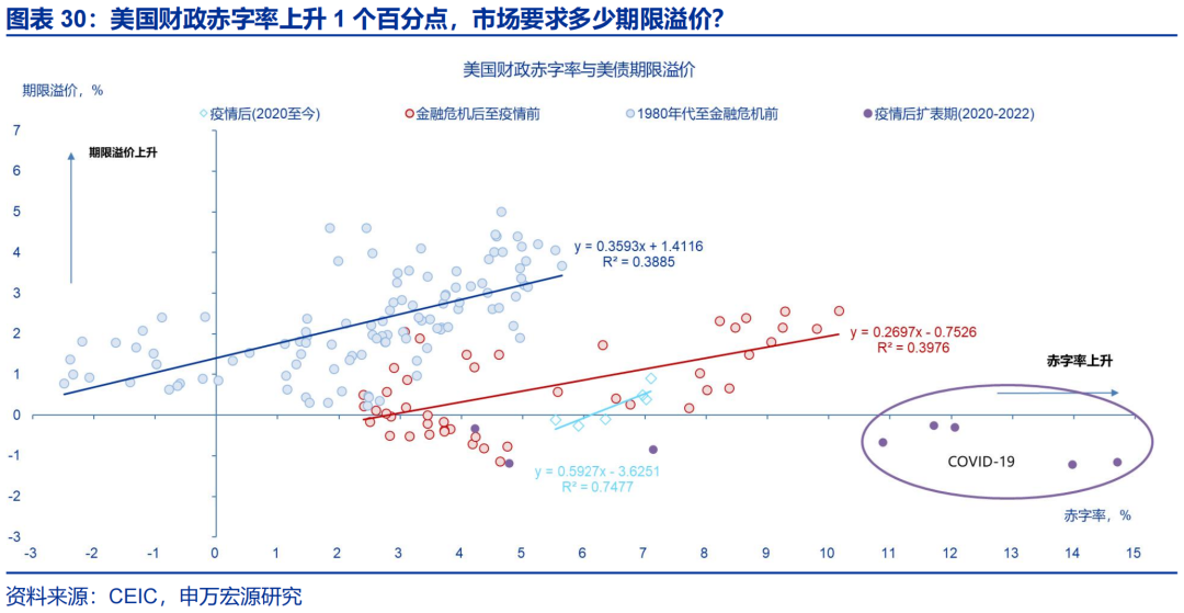 究其原因,货币政策不确定性、美债流动性和通胀风险等在不同阶段均扮演着一定的角色。2023年3季度财政部再融资会议之后长端美债利率的大幅抬升,与债务上限暂停后美国财政部增加长端美债发行规模有关。经验上,期限溢价与美国财政赤字率正相关,且敏感系数在本轮通胀冲击后显著提升,金融危机之前和之后分别为0.36和0.27,但2022年以来增加到了0.59——财政赤字率上升1个百分点,市场要求的期限溢价将上升约59bps。