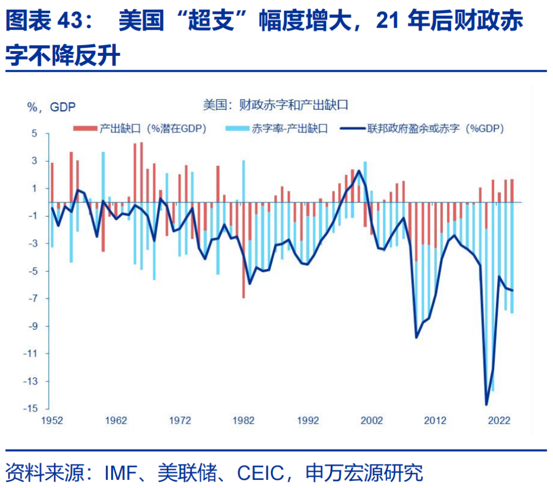 美国政府的财政和债务已进入“类战时状态”,财政整顿是必要的。美国政府“花钱解决问题”的冲动有加无已,赤字率和杠杆率堪比战时。历史上,赤字率具有显著的逆周期性,且扩张规模与产出缺口较为匹配,但2008年以来,超支和减收双管齐下,顺周期性越来越显著。