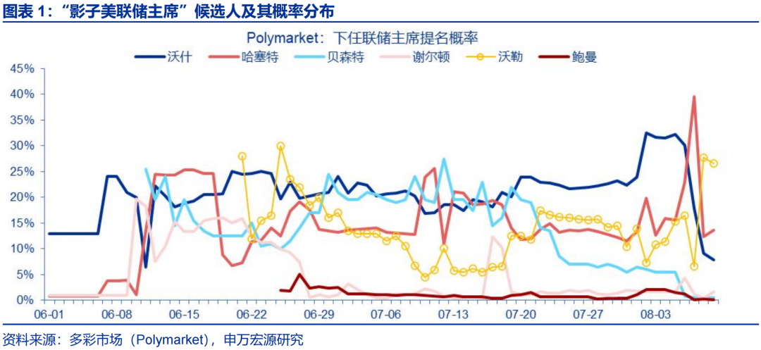 6月初以来,美国总统特朗普何时提名以及提名谁为“影子美联储主席”的话题热度不减。截止到8月9日,市场预计的前三位“影子主席”候选人分别为:美联储理事沃勒(26.6%)、白宫国家经济委员会(NEC)主任哈赛特(13.7%)和前美联储理事沃什(7.9%)。
