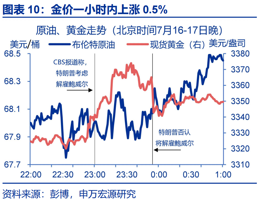 另一类交易是美联储丧失独立性,市场表现为“股债汇三杀”。7月16-17日,特朗普可能“解雇”鲍威尔的消息引发“股债汇三杀”,但辟谣后恢复正常。北京时间7月16日晚11点左右,特朗普即将“解雇”鲍威尔的消息导致市场重现“股债汇三杀”,黄金应声上涨,美债曲线显著“陡峭化”。这是在定价“美联储失去独立性”。市场的理解是,若鲍威尔被“解雇”,特朗普提名的新一任美联储主席或将提前降息。市场在在特朗普“辟谣”后恢复正常。事实上,特朗普政府内部已有官员对解雇鲍威尔持反对意见,美国财长贝森特、商务部长卢特尼克便是代表,其核心担忧在于此举可能对市场造成过大冲击。自特朗普访问美联储之后,市场预计鲍威尔2025年底离任的概率越来越小。